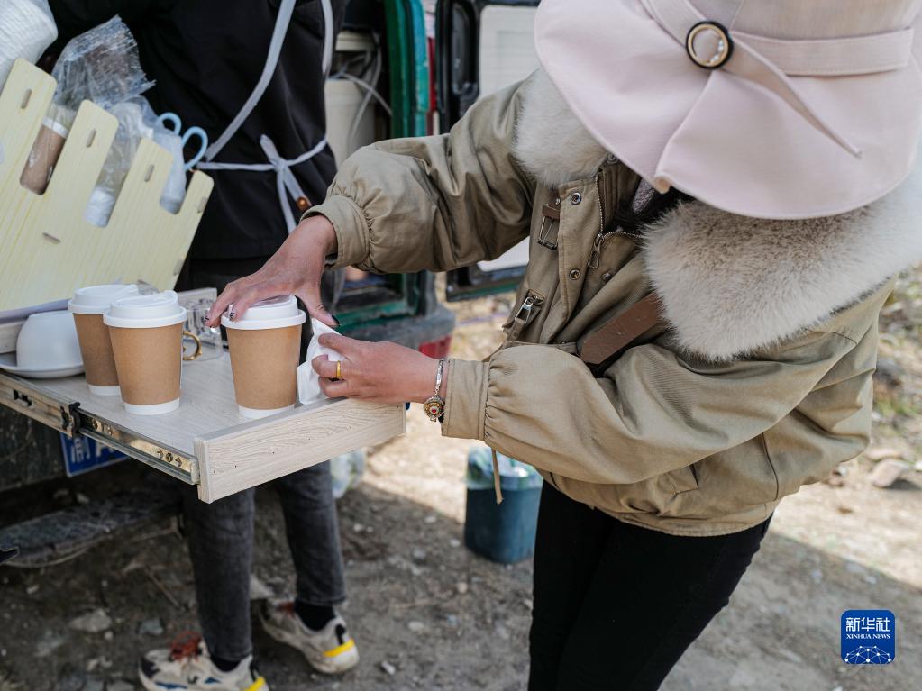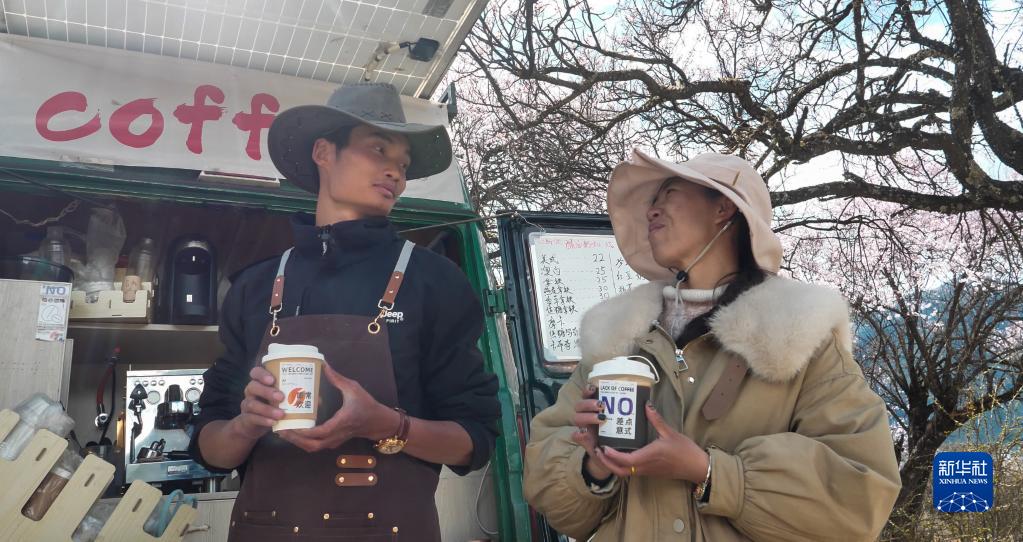 桃花谷中,咖啡車(chē)停在桃樹(shù)下,車(chē)后遠(yuǎn)處是連綿的雪山。樹(shù)上的桃花被風(fēng)吹落,一朵花瓣剛巧落在還未來(lái)得及封蓋的咖啡里,但顧客對(duì)此并不在意,“這才有林芝春天的感覺(jué)!”他說(shuō)。