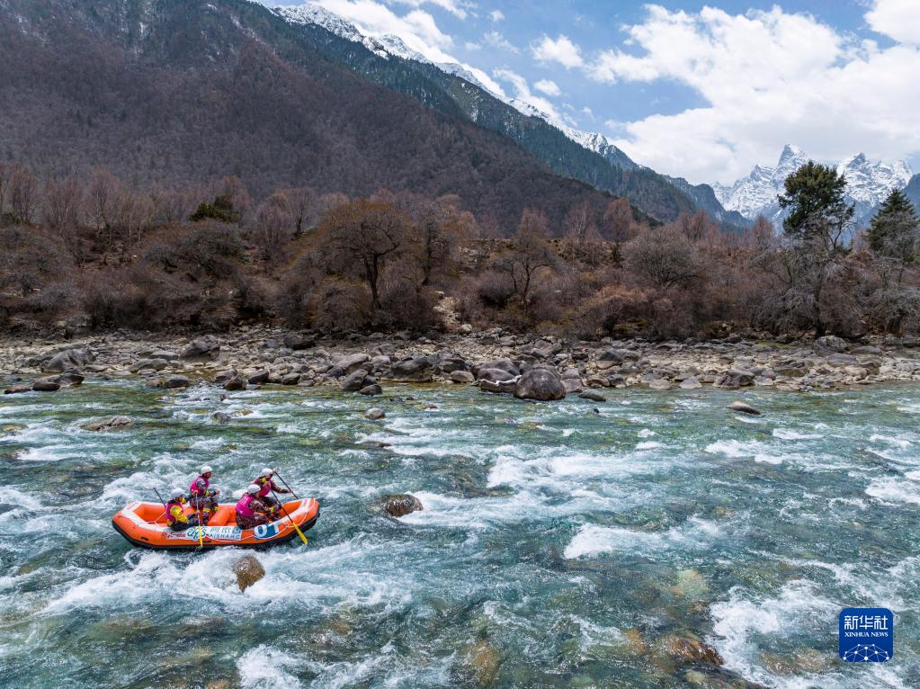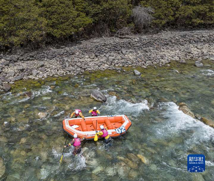 4月16日,“西藏旅游股份有限公司漂流隊”選手在激流漂流筏繞標(biāo)賽中,他們最終獲得季軍(無人機照片)。新華社記者 孫非 攝
