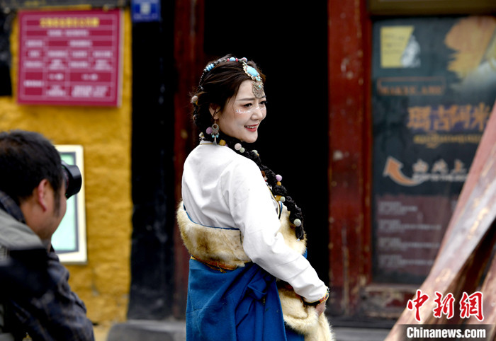 5月19日,游客身著民族特色的服裝在拉薩八廓街拍照留念。5月的拉薩初夏,草木漸茂、綠樹(shù)成蔭,雨量充沛、濕度適宜,日光充盈卻少了一絲燥熱,成為了眾多游客選擇進(jìn)藏的最佳時(shí)節(jié)。 中新社記者 李林 攝