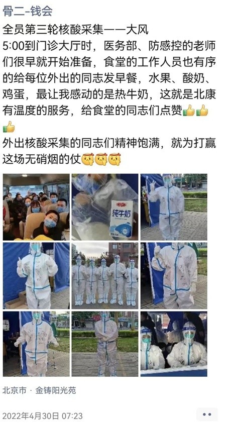 4月30日是五一小長(zhǎng)假第一天,晚7點(diǎn),宣武醫(yī)院神經(jīng)內(nèi)科電生理專業(yè)組工作群的消息突然響了,組長(zhǎng)黃朝陽(yáng)發(fā)布了一條信息:“5月1日和3日各需5人支援西城核酸采樣任務(wù),請(qǐng)大家積極響應(yīng),積極報(bào)名!”看到醫(yī)院緊急通知,同事們用無(wú)聲、快速地接龍做出了回應(yīng),名額很快報(bào)滿,很多沒(méi)報(bào)上的同事還主動(dòng)要求成為候補(bǔ)。