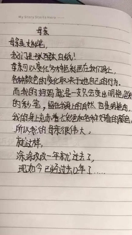 在與孩子們視頻通話時(shí),盛楠收到了一封來(lái)自大女兒親筆寫(xiě)的信:“母親是支彩筆,我們是張白紙。母親可以變化多種色彩畫(huà)在我們身上,各種顏色的變化取決于她自己的行為。而我的媽媽就是一支只會(huì)變出明艷色彩的彩筆,留在我身上的自然也是明艷的,我的身上充斥著七彩色和各種好看的顏色,所以我的母親很偉大。就這樣,涂涂改改一年就過(guò)去了,現(xiàn)如今已經(jīng)過(guò)去12年了……”讀到這里盛楠濕潤(rùn)了眼眶。