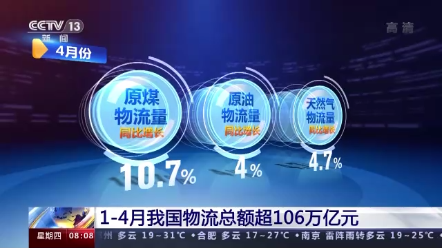 4月份,原煤、原油、天然氣等物流量同比分別增長(zhǎng)10.7%、4%和4.7%。