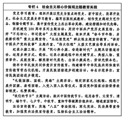 持續(xù)深化社會主義核心價值觀宣傳教育,增進認知認同、樹立鮮明導(dǎo)向、強化示范帶動。堅持貫穿結(jié)合融入、落細落小落實,把社會主義核心價值觀要求融入日常生活,融入法治建設(shè)。推動理想信念教育常態(tài)化制度化,筑牢黨員干部、青少年等重點群體的理想信念之基。圍繞“七一”、“八一”、“十一”等重大時間節(jié)點,依托革命歷史類紀念設(shè)施、遺址和愛國主義教育基地等載體,加強愛國主義、集體主義、社會主義教育,弘揚黨和人民在各個歷史時期奮斗中形成的偉大精神。加強公益廣告宣傳。統(tǒng)籌開展誠信教育、勤儉節(jié)約教育、勞動創(chuàng)造幸福主題宣傳教育。強化祖國統(tǒng)一和民族團結(jié)進步宣傳教育,深化“一國兩制”實踐教育,強化全民國防教育,促進平安中國建設(shè)。