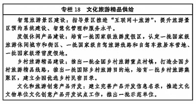 適應(yīng)大眾旅游時代新要求,推進旅游為民,推動構(gòu)建類型多樣、分布均衡、特色鮮明、品質(zhì)優(yōu)良的旅游供給體系,推動文化和旅游業(yè)態(tài)融合、產(chǎn)品融合、市場融合。提升旅游演藝、文化遺產(chǎn)旅游、文化主題酒店、特色節(jié)慶展會等品質(zhì),支持建設(shè)集文化創(chuàng)意、旅游休閑等于一體的文化和旅游綜合體。依托革命博物館、黨史館、紀念館、革命遺址遺存遺跡等,打造紅色旅游經(jīng)典景區(qū)和經(jīng)典線路。利用鄉(xiāng)村文化傳統(tǒng)和資源,發(fā)展鄉(xiāng)村旅游。加強對當代社會主義建設(shè)成就的旅游開發(fā),深入挖掘重大工程項目的精神內(nèi)涵,發(fā)展特色旅游。加強對工業(yè)遺產(chǎn)資源的活化利用,開發(fā)旅游用品、特色旅游商品,培育旅游裝備制造業(yè),發(fā)展工業(yè)旅游。推動旅游與現(xiàn)代生產(chǎn)生活有機結(jié)合,加快發(fā)展度假休閑旅游、康養(yǎng)旅游、研學(xué)實踐活動等,打造一批國家全域旅游示范區(qū)、A級旅游景區(qū)、國家級旅游度假區(qū)、國家精品旅游帶、國家旅游風(fēng)景道、特色旅游目的地、特色旅游功能區(qū)、城市綠道、騎行公園和慢行系統(tǒng)。大力發(fā)展智慧旅游,推進智慧景區(qū)、度假區(qū)建設(shè)。