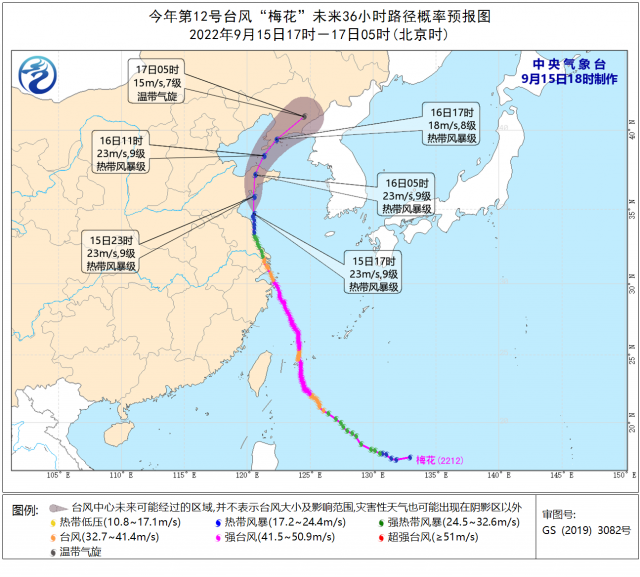 臺風“梅花”移動路徑。中央氣象臺9月15日18時制作