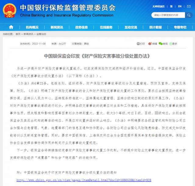 銀保監(jiān)會(huì)網(wǎng)站11月8日消息,為進(jìn)一步提升財(cái)產(chǎn)保險(xiǎn)災(zāi)害事故處置能力,切實(shí)發(fā)揮保險(xiǎn)防災(zāi)減損和經(jīng)濟(jì)補(bǔ)償功能。近日,中國(guó)銀保監(jiān)會(huì)印發(fā)《財(cái)產(chǎn)保險(xiǎn)災(zāi)害事故分級(jí)處置辦法》(以下簡(jiǎn)稱(chēng)《辦法》)。