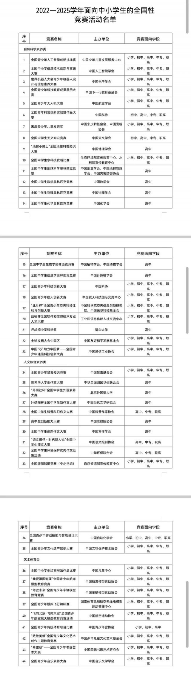 教育部提示,有關市場主體要合法合規(guī)經(jīng)營,不要違規(guī)舉辦面向中小學生的競賽活動,對于違規(guī)競賽活動,教育部門將會同市場監(jiān)管等部門依法依規(guī)嚴肅處理;廣大學生和家長要擦亮眼睛,凡是未列入“面向中小學生的全國性競賽活動名單”的均是違規(guī)競賽,名單內(nèi)沒有面向義務教育階段學生的學科類競賽,所有競賽均不得向?qū)W生和家長收取任何費用,競賽及競賽產(chǎn)生的結(jié)果均不作為中小學招生入學的依據(jù),也不作為高考加分項目;各級教育行政部門和學校要加強政策宣傳和提醒,引導廣大家長、學生理性看待各類競賽活動,自覺抵制違規(guī)競賽。