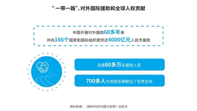 中國先后批準或加入了30余項國際人權文書,其中包括6項聯(lián)合國核心人權條約;累計共向166個國家和國際組織提供了援助,派遣60多萬名援助人員;多次無條件免除重債窮國和最不發(fā)達國家對華到期政府無息貸款債務。在聯(lián)合國維和行動中,中國是安理會常任理事國第一大出兵國,30多年來累計派出維和官兵5萬余人次。共建“一帶一路”已成為助力各國發(fā)展、深受世界歡迎的新興國際公共產(chǎn)品,據(jù)世界銀行研究報告,到2030年,將使相關國家760萬人擺脫極端貧困、3200萬人擺脫中度貧困。新冠肺炎疫情暴發(fā)以來,中國努力促進新冠疫苗在全球范圍內(nèi)公平合理分配,成為全球?qū)ν馓峁┮呙鐢?shù)量最多的國家。