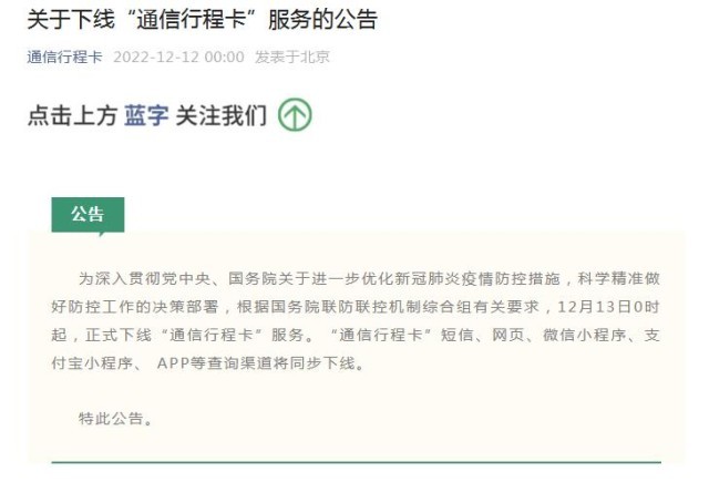12月13日0時起,“通信行程卡”服務(wù)將正式下線