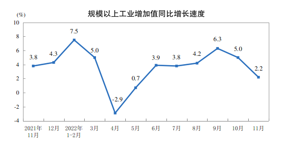 國家統(tǒng)計局:2022年11月份規(guī)模以上工業(yè)增加值增長2.2%