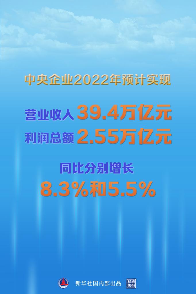 新華社北京1月5日電(記者王希)2022年,國資央企統(tǒng)籌疫情防控和企業(yè)生產經營,統(tǒng)籌發(fā)展和安全,推動經濟運行實現(xiàn)穩(wěn)中有進,中央企業(yè)全年預計實現(xiàn)營業(yè)收入39.4萬億元、利潤總額2.55萬億元,同比分別增長8.3%和5.5%。