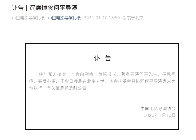 中新網(wǎng)1月10日電 據(jù)中國電影導(dǎo)演協(xié)會消息,經(jīng)與家人核實(shí),中國電影導(dǎo)演協(xié)會前副會長兼秘書長,著名導(dǎo)演何平先生,罹患癌癥,突發(fā)心梗,于1月10日凌晨在北京去世。中國電影導(dǎo)演協(xié)會執(zhí)委會將協(xié)同何平導(dǎo)演家人為他送行,有關(guān)信息將及時公告。