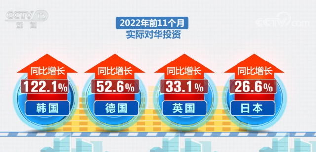 2022年前9個月,中國吸收外資規(guī)模就達(dá)到1萬億元;前11個月,突破1.15萬億元,超過2021年全年水平;與此同時,外資來源更加多元。2022年前11個月,韓國、德國、英國、日本等國家的實際對華投資同比分別增長122.1%、52.6%、33.1%和26.6%。