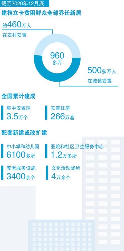 習(xí)近平總書記強(qiáng)調(diào):“易地搬遷是解決一方水土養(yǎng)不好一方人、實現(xiàn)貧困群眾跨越式發(fā)展的根本途徑,也是打贏脫貧攻堅戰(zhàn)的重要途徑。”黨的十八大以來,全國累計建成集中安置區(qū)3.5萬個、安置住房266萬套。到2020年底,全國易地扶貧搬遷規(guī)劃建設(shè)任務(wù)全面完成,近千萬生活在“一方水土難養(yǎng)一方人”地方的建檔立卡貧困人口實現(xiàn)易地扶貧搬遷,搬入新家園、開啟新生活。