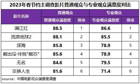 從普通觀眾和專業(yè)觀眾評價排序上看,《滿江紅》和《流浪地球2》得到了普通觀眾和專業(yè)觀眾的一致認可,前者普通觀眾滿意度得分88.5分、專業(yè)觀眾滿意度得分86.6分,分別居歷史調查影片的第七位、第六位;后者普通觀眾滿意度得分88.1分、專業(yè)觀眾滿意度得分85.5分,均居歷史調查影片的第九位。同時,普通觀眾和專業(yè)觀眾對于《熊出沒 伴我“熊芯”》和《交換人生》評價排序也都保持一致,分別列第四位、第六位,此處需要說明的是中國電影觀眾滿意度調查樣本目前并未覆蓋12歲以下的兒童群體。在評價差異上,普通觀眾對于《深海》、專業(yè)觀眾對于《無名》評價排序列分別列第三位,反之分別列第五位。