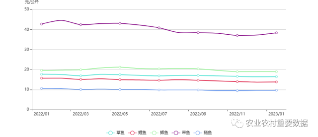 2023年1月,帶魚批發(fā)價(jià)格為38.41元/公斤,比上月上漲3.03%;草魚、鯉魚、鯽魚和鰱魚批發(fā)價(jià)格分別為16.47元/公斤、13.84元/公斤、18.98元/公斤、9.66元/公斤,與上月基本持平。