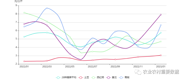 2023年1月,28種蔬菜平均批發(fā)價(jià)格為5.75元/公斤,環(huán)比上漲22.60%,其中:土豆、西紅柿、黃瓜和青椒批發(fā)價(jià)格分別為3.04元/公斤、4.70元/公斤、7.91元/公斤、6.66元/公斤,比上月分別上漲4.11%、7.80%、25.76%、65.67%。