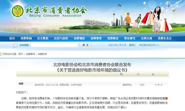 北京消費(fèi)者協(xié)會(huì)倡議:維護(hù)電影市場(chǎng)秩序 加強(qiáng)對(duì)放映質(zhì)量管理