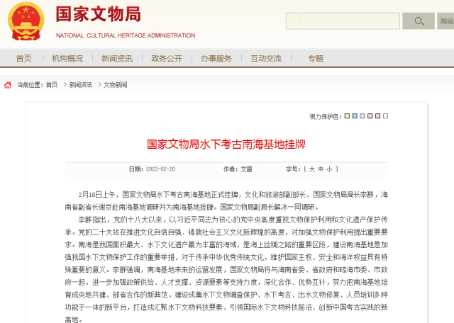 文化和旅游部副部長、國家文物局局長李群表示,南海是我國面積最大、水下文化遺產(chǎn)最為豐富的海域,是海上絲綢之路的重要區(qū)段。國家文物局將努力把南海基地培育成央地共建、部省合作的新典范,建設(shè)成集水下文物調(diào)查保護、水下考古、出水文物修復(fù)、人員培訓(xùn)多種功能于一體的新平臺,打造成匯聚水下文物科技要素、引領(lǐng)世界水下文物科技前沿、創(chuàng)新中國考古實踐的新高地。