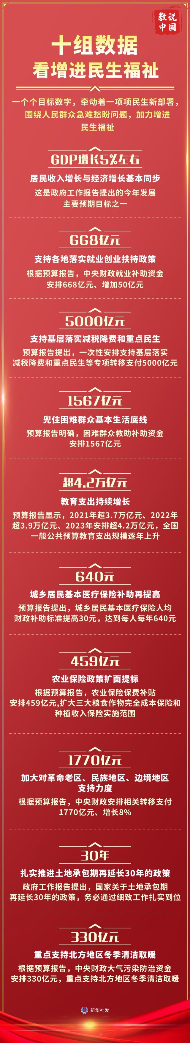 翻開5日提請(qǐng)第十四屆全國(guó)人民代表大會(huì)第一次會(huì)議審議的政府工作報(bào)告和提請(qǐng)審查的計(jì)劃報(bào)告、預(yù)算報(bào)告,一個(gè)個(gè)目標(biāo)數(shù)字,牽動(dòng)著一項(xiàng)項(xiàng)民生新部署,圍繞人民群眾急難愁盼問(wèn)題,加力增進(jìn)民生福祉。