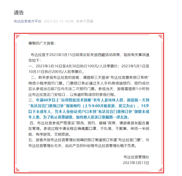 央視網(wǎng)消息:據(jù)布達(dá)拉宮官方平臺(tái)微信公眾號消息,布達(dá)拉宮于2023年3月15日結(jié)束此輪冬游西藏活動(dòng)政策,現(xiàn)將有關(guān)事項(xiàng)通告如下: