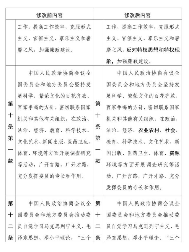 中國(guó)人民政治協(xié)商會(huì)議章程 修改前后內(nèi)容對(duì)照表