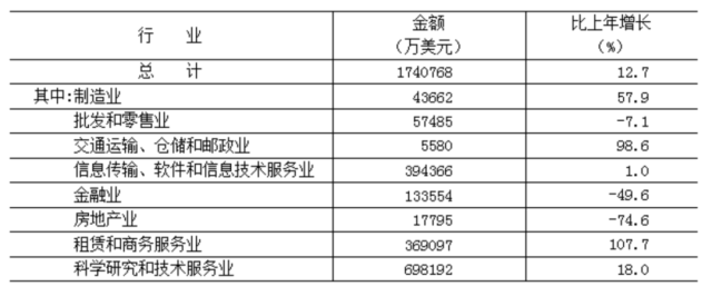 全年實際利用外商直接投資174.1億美元,按可比口徑[8]計算,比上年增長12.7%。其中,科學(xué)研究和技術(shù)服務(wù)業(yè)69.8億美元,占40.1%,增長18.0%;信息傳輸、軟件和信息技術(shù)服務(wù)業(yè)39.4億美元,占22.7%,增長1.0%;租賃和商務(wù)服務(wù)業(yè)36.9億美元,占21.2%,增長1.1倍。
