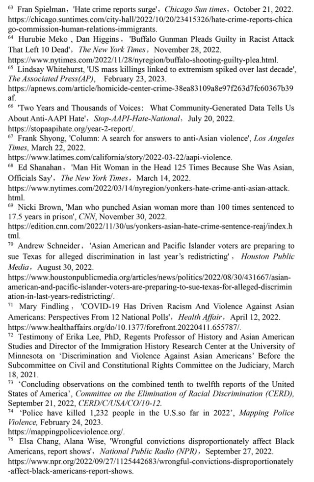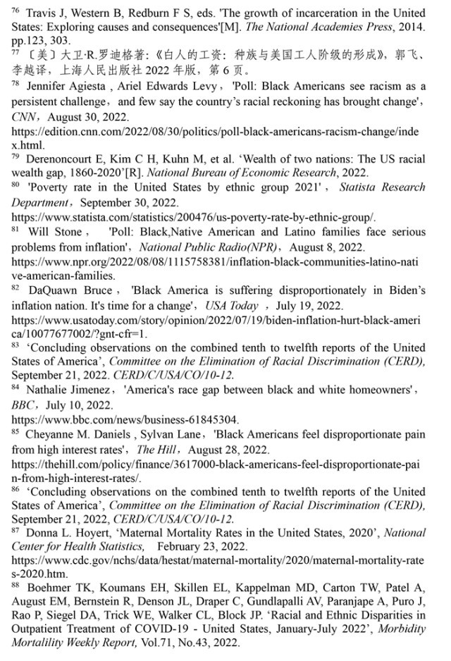 聯(lián)合國消除種族歧視委員會2022年9月21日發(fā)布的關(guān)于審議美國履行《消除一切形式種族歧視國際公約》情況的結(jié)論性報(bào)告指出,美國歷史上殖民主義和奴隸制留下的陰影至今仍揮之不去,助長著美國社會流行的種族主義。近幾年來,美國仇恨犯罪和仇恨言論事件顯著增加,與種族有關(guān)的槍支死傷人數(shù)大幅增加,有色人種和少數(shù)族裔在醫(yī)療、教育、住房等領(lǐng)域持續(xù)面臨系統(tǒng)性歧視。(注57)