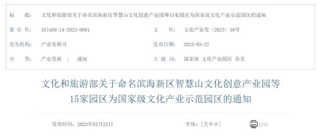 根據(jù)文化和旅游部關(guān)于命名濱海新區(qū)智慧山文化創(chuàng)意產(chǎn)業(yè)園等15家園區(qū)為國家級文化產(chǎn)業(yè)示范園區(qū)的通知,此次新獲命名的園區(qū)包括天津市濱海新區(qū)智慧山文化創(chuàng)意產(chǎn)業(yè)園、河北省中國曲陽雕塑文化產(chǎn)業(yè)園、江蘇省南京秦淮特色文化產(chǎn)業(yè)園、浙江省衢州儒學(xué)文化產(chǎn)業(yè)園、湖南省馬欄山視頻文創(chuàng)產(chǎn)業(yè)園、西藏自治區(qū)西藏文化旅游創(chuàng)意園區(qū)等。