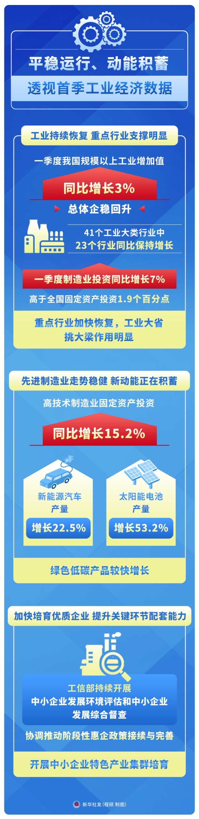 “面對復雜多變的外部環(huán)境和各種風險挑戰(zhàn),各地各部門狠抓政策落實,加快復工復產,強化助企紓困,一季度工業(yè)實現(xiàn)平穩(wěn)開局?!惫ば挪靠偣こ處熩w志國說,工業(yè)生產穩(wěn)步回升的同時,制造業(yè)投資持續(xù)增長。