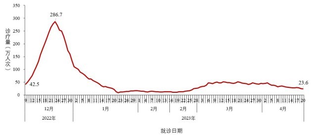 ?。ㄒ唬┛傮w就診人數(shù)結(jié)果。全國(不含港澳臺)發(fā)熱門診(診室)就診人數(shù)于2022年12月23日達到峰值286.7萬人次,隨后連續(xù)下降;2023年1月23日后就診人數(shù)呈現(xiàn)低位波動,約6周(2月24日-4月6日)的波動增加及平臺波動后,近2周(4月7日-4月20日)呈下降趨勢,4月20日為23.6萬人次,較峰值下降了91.8%(圖2-1)。