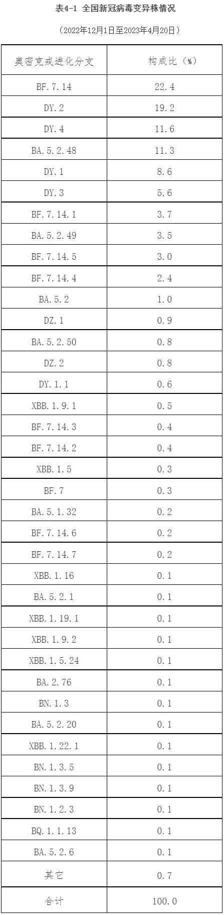 (二)12月以來本土病例病毒變異株監(jiān)測情況。2022年12月1日至2023年4月20日,全國共報送32993例本土病例新冠病毒基因組有效序列,均為奧密克戎變異株,涵蓋117個進化分支。主要流行株為BA.5.2及其亞分支(構(gòu)成比64.3%)和BF.7及其亞分支(構(gòu)成比33.0%)等。其中,BA.5.2及其亞分支包括DY.2(19.2%)、DY.4(11.6%)、BA.5.2.48(11.3%)、DY.1(8.6%)、DY.3(5.6%)和BA.5.2.49(3.5%)等;BF.7及其亞分支包括BF.7.14(22.4%)、BF.7.14.1(3.7%)、BF.7.14.5(3.0%)、BF.7.14.4(2.4%)、BF.7.14.3(0.4%)和BF.7.14.2(0.3%)等(表4-1)。共監(jiān)測到本土重點關(guān)注變異株603例,其中,4例BQ.1、4例BQ.1.1、19例BQ.1.1.13、1例BQ.1.1.17、1例BQ.1.1.18、1例BQ.1.1.35、1例BQ.1.1.38、1例BQ.1.1.46、1例BQ.1.1.53、2例BQ.1.1.66、1例BQ.1.1.69、8例BQ.1.2、1例BQ.1.23、2例BQ.1.8、2例CH.1.1、3例CH.1.1.1、1例CH.1.1.11、1例DT.2、1例EA.1、2例EG.1、3例EL.1、7例EM.1、1例EU.1.1、2例FB.1、3例FE.1、1例XBB、4例XBB.1、2例XBB.1.11.1、1例XBB.1.12、4例XBB.1.15、42例XBB.1.16、5例XBB.1.16.1、16例XBB.1.17.1、37例XBB.1.19.1、2例XBB.1.22、22例XBB.1.22.1、1例XBB.1.23、5例XBB.1.24、1例XBB.1.4、109例XBB.1.5、2例XBB.1.5.11、9例XBB.1.5.12、2例XBB.1.5.15、7例XBB.1.5.23、35例XBB.1.5.24、1例XBB.1.5.28、1例XBB.1.5.32、1例XBB.1.5.36、1例XBB.1.5.5、2例XBB.1.5.7、2例XBB.1.9、163例XBB.1.9.1、35例XBB.1.9.2、1例XBB.1.9.3、1例XBB.1.9.5、11例XBB.2.3、1例XBB.2.3.2、1例XBB.2.4和2例XBB.3。