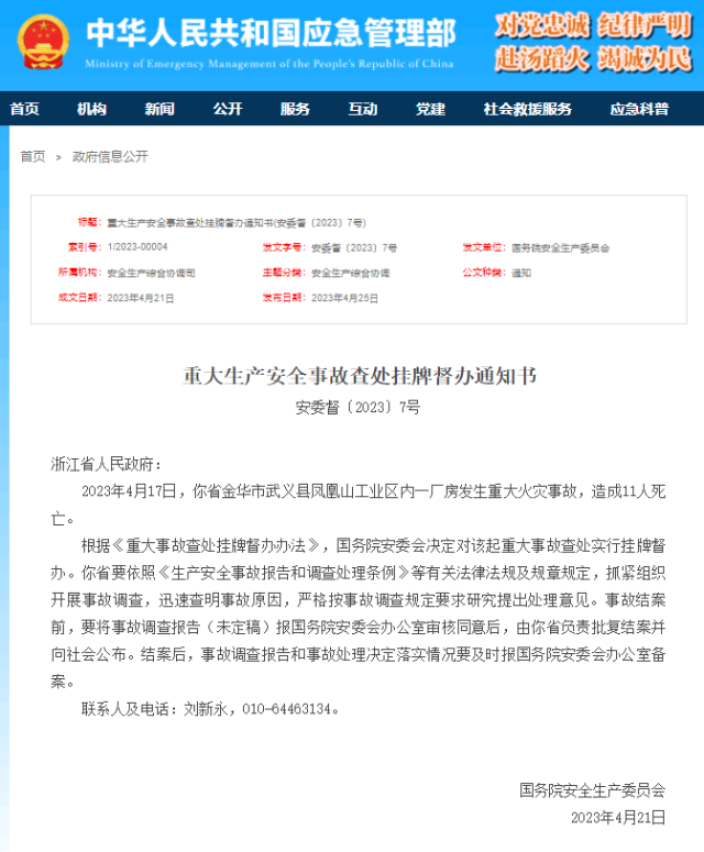 國務(wù)院安委會(huì)近日發(fā)布通知書,決定對(duì)浙江金華一廠房重大火災(zāi)事故查處實(shí)行掛牌督辦。具體通知如下: