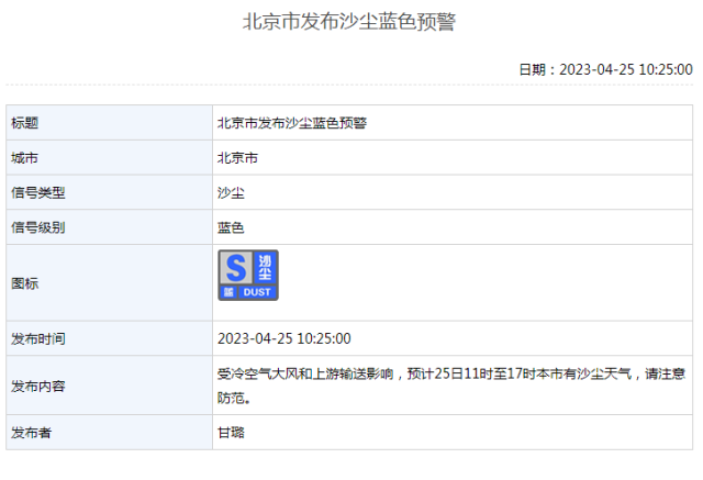 2023年04月25日10時25分,北京市氣象臺發(fā)布沙塵藍色預警。