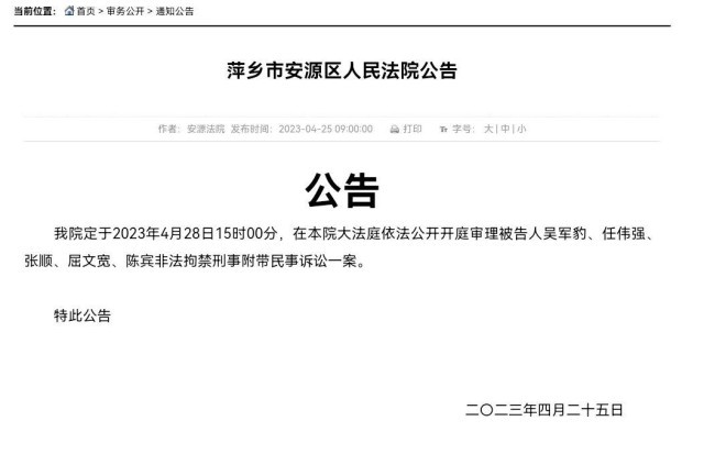 記者今天(25日)獲悉,備受關(guān)注的江西南昌豫章書院非法拘禁刑事附帶民事訴訟一案將于4月28日15時在江西省萍鄉(xiāng)市安源區(qū)人民法院繼續(xù)開庭審理。