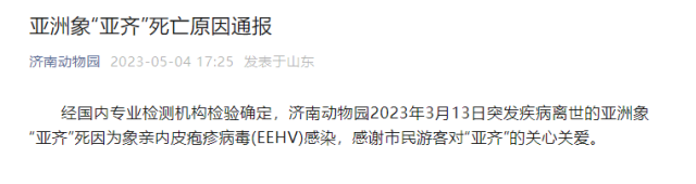 濟(jì)南動物園通報亞洲象“亞齊”死亡原因