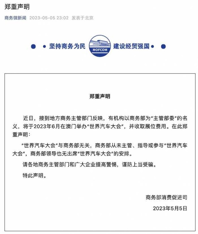 央視網消息:據“商務微新聞”公眾號消息,近日,接到地方商務主管部門反映,有機構以商務部為“主管部委”的名義,將于2023年6月在澳門舉辦“世界汽車大會”,并收取展位費用。在此鄭重聲明:“世界汽車大會”與商務部無關,商務部從未主管、指導或參與“世界汽車大會”,商務部領導也無出席“世界汽車大會”的安排。請各地商務主管部門和廣大企業(yè)提高警惕,謹防上當受騙。