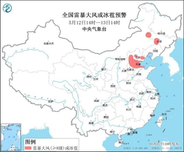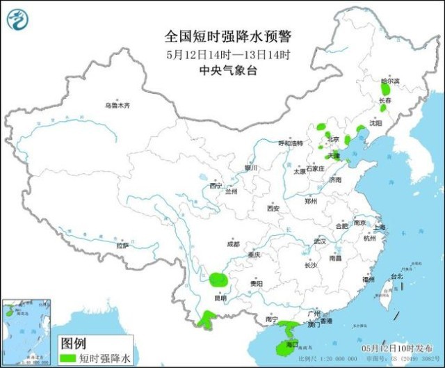 預計5月12日14時至13日14時,河北中部和東北部、北京西北部和南部、天津南部、吉林中西部、遼寧西北部、山東北部等地的部分地區(qū)將有8-10級雷暴大風或冰雹天氣;吉林中部、遼寧西部、河北中北部、北京西北部、天津南部、山東北部、四川南部、云南南部、廣西東南部、廣東西南部、海南島等地的部分地區(qū)將有短時強降水天氣,小時雨量20-40毫米,局地可達50毫米以上。