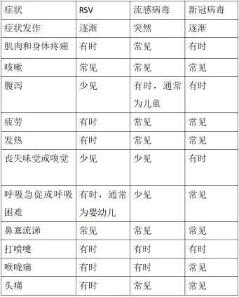 針對年初到現(xiàn)在流行的新冠病毒、甲型流感病毒和呼吸道合胞病毒,唐蘭芳解釋說,這三種病毒都是通過呼吸道傳播、且傳染性強的病毒,均會引起發(fā)熱、咳嗽及鼻塞流涕等癥狀,因此有時很難區(qū)分感染了哪種病毒,雖然這些病毒有不少相似的癥狀,但也有一些區(qū)別,如流感病毒感染潛伏期短,通常是突然發(fā)熱,高熱為主,而另外兩種則是逐漸發(fā)病,且呼吸道合胞病毒感染的患兒中腹瀉較為少見,可以參考表格內(nèi)容,明確診斷的話建議行相關核酸或抗原檢測。