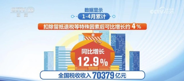 數(shù)據(jù)顯示,1月—4月累計(jì),全國稅收收入70379億元,同比增長12.9%,扣除留抵退稅等特殊因素后可比增長約4%。