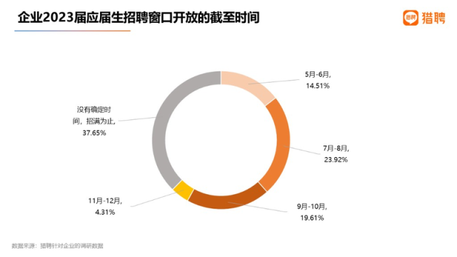 據(jù)了解,2023屆高校畢業(yè)生規(guī)模預(yù)計(jì)1158萬人,同比增加82萬人。本次調(diào)研中,有37.65%的企業(yè)表示校招窗口期“沒有確定截止時間,招滿為止”,23.92%的企業(yè)表示“最晚到7-8月”,19.61%的企業(yè)把期限定為9-10月。