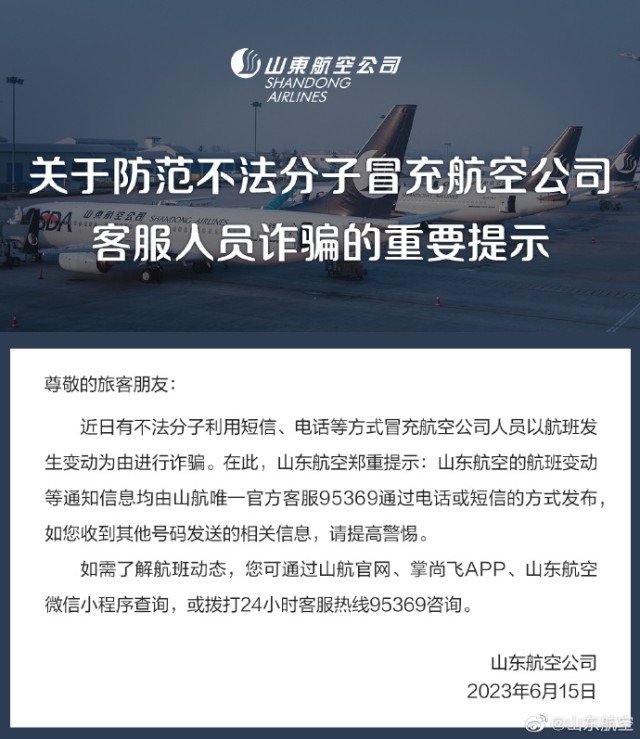 山東航空發(fā)布提示:近日有不法分子冒充航司人員以航班發(fā)生變動為由詐騙
