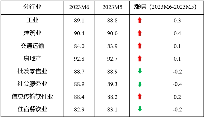 具體來(lái)看,6月份,8個(gè)分行業(yè)指數(shù)5升3降,工業(yè)、建筑業(yè)、交通運(yùn)輸郵政倉(cāng)儲(chǔ)業(yè)、房地產(chǎn)業(yè)和信息傳輸計(jì)算機(jī)服務(wù)軟件業(yè)指數(shù)分別上升0.3、0.4、0.1、0.1和0.2點(diǎn),而批發(fā)零售業(yè)、社會(huì)服務(wù)業(yè)和住宿餐飲業(yè)指數(shù)分別下降0.2、0.4和0.2點(diǎn)。由此可見,工業(yè)和建筑業(yè)指數(shù)開始回升;而服務(wù)業(yè)指數(shù)的上漲勢(shì)頭出現(xiàn)回調(diào)。
