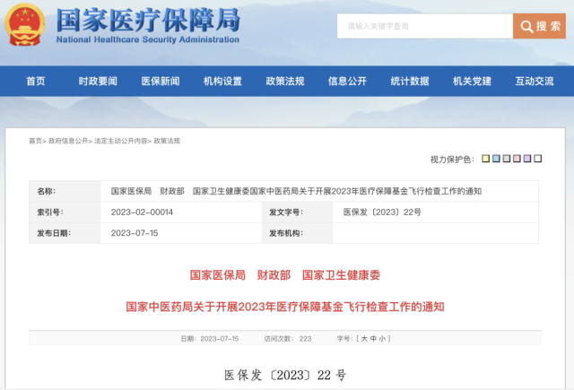 國(guó)家醫(yī)保局、財(cái)政部、國(guó)家衛(wèi)生健康委、國(guó)家中醫(yī)藥局14日聯(lián)合印發(fā)《關(guān)于開(kāi)展2023年醫(yī)療保障基金飛行檢查工作的通知》,將在全國(guó)范圍內(nèi)組織開(kāi)展2023年醫(yī)?;痫w行檢查。