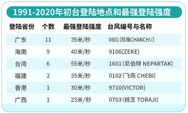預(yù)計(jì),臺風(fēng)“泰利”將在廣東陽江到海南文昌一帶沿海登陸,那么常年初臺更“青睞”在哪里“上岸”呢?通過常年統(tǒng)計(jì)數(shù)據(jù)我們可以看到,初臺一般在華南等低緯度沿海地區(qū)登陸,初臺最常登陸地為廣東省(11個(gè))、海南省(9個(gè))和臺灣?。?個(gè))。