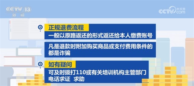 正規(guī)退費流程一般以原路返還的形式返還給本人繳費賬號,凡是退款時附加購買商品或支付費用條件的都是詐騙。如有疑問,可及時撥打110或有關培訓機構(gòu)主管部門電話求證、求助。