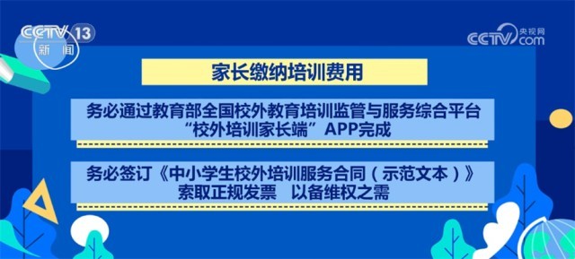 家長繳納培訓費用,務(wù)必通過教育部全國校外教育培訓監(jiān)管與服務(wù)綜合平臺“校外培訓家長端”APP完成;務(wù)必簽訂《中小學生校外培訓服務(wù)合同(示范文本)》,索取正規(guī)發(fā)票,以備維權(quán)之需;務(wù)必控制額度,一次性繳費不要超過3個月或60課時,且不要超過5000元,切勿受“充值贈送”等方式誘惑,繳納高額培訓費。