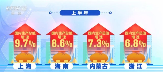 從上半年各省份的國內生產總值增速看,江蘇、浙江等15個省份增速超過全國5.5%的增速,其中,上海、海南、內蒙古和浙江等省份增速均在6.8%以上,廣東、江蘇、山東等21個省份的國內生產總值增速超過了各自一季度的增速,經濟增長恢復勢頭明顯。