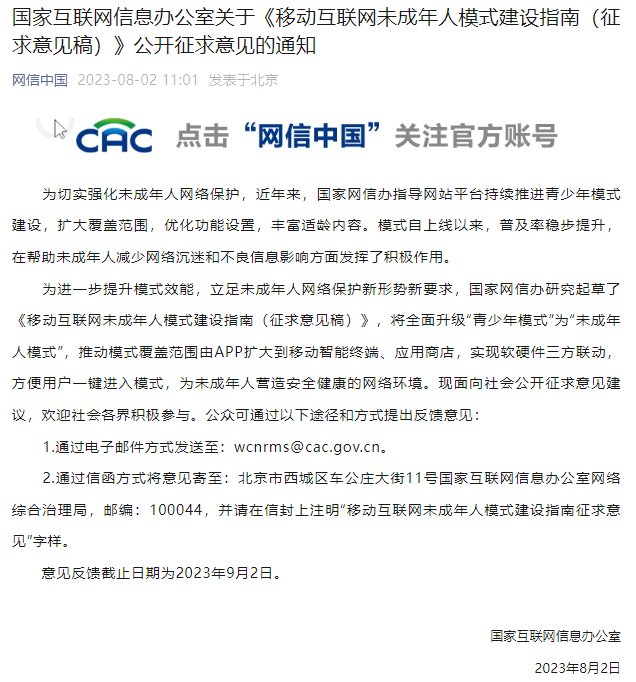 國家互聯(lián)網(wǎng)信息辦公室關(guān)于《移動(dòng)互聯(lián)網(wǎng)未成年人模式建設(shè)指南(征求意見稿)》公開征求意見的通知