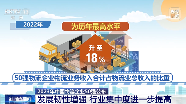 中國(guó)物流與采購(gòu)聯(lián)合會(huì)今天發(fā)布了2023年度中國(guó)物流企業(yè)50強(qiáng)。從物流業(yè)務(wù)收入占比來(lái)看,50強(qiáng)物流企業(yè)的物流業(yè)務(wù)收入占物流業(yè)總收入的比重升至歷年最高,并且50強(qiáng)物流企業(yè)門(mén)檻大幅提高,顯示物流行業(yè)發(fā)展韌性較強(qiáng),行業(yè)集中度進(jìn)一步提高。